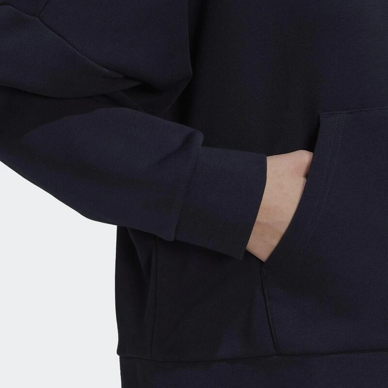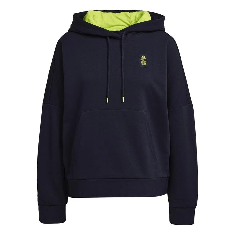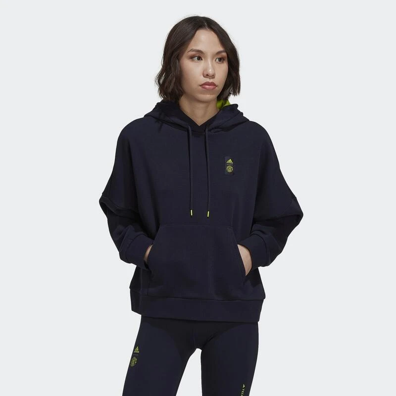 Luid en duidelijk. De kleuraccenten op deze adidas voetbalhoodie komen regelrecht van het levendige derde tenue van Manchester United. Van het subtiele clubembleem op de borst tot de comfortabele capuchonvoering springen felgroene details van de donkerblauwe sweaterstof. Door de losvallende pasvorm en de ruime capuchon voelt de sweater iets relaxter aan.Onze katoenen kleding ondersteunt duurzamere katoenproductie.